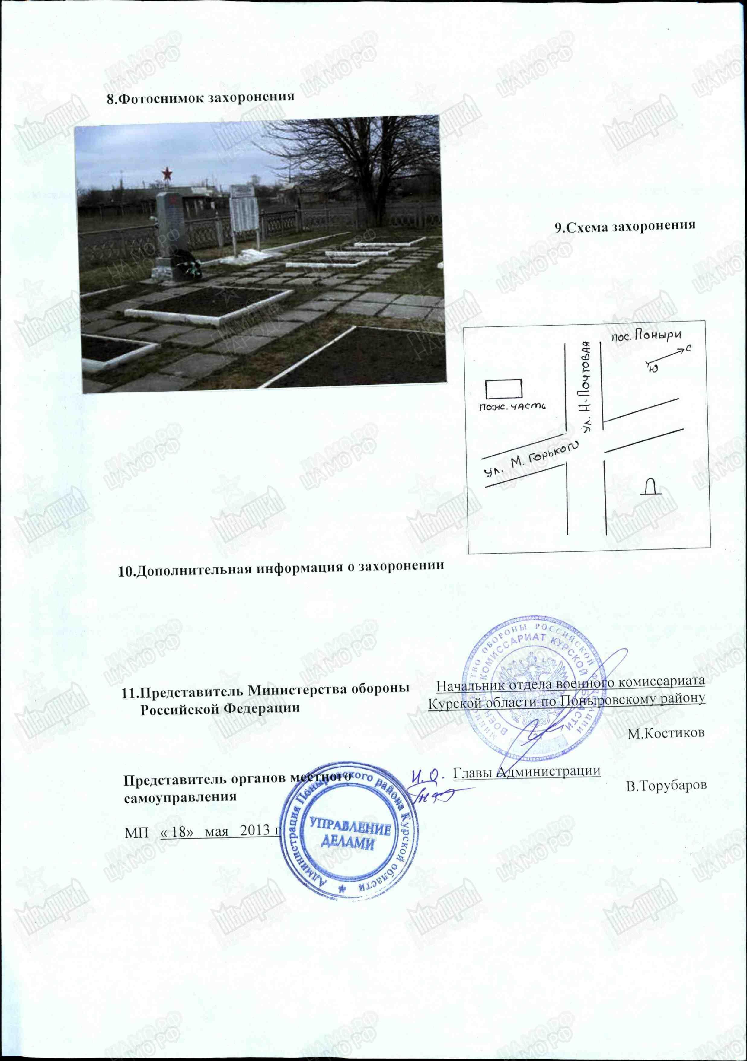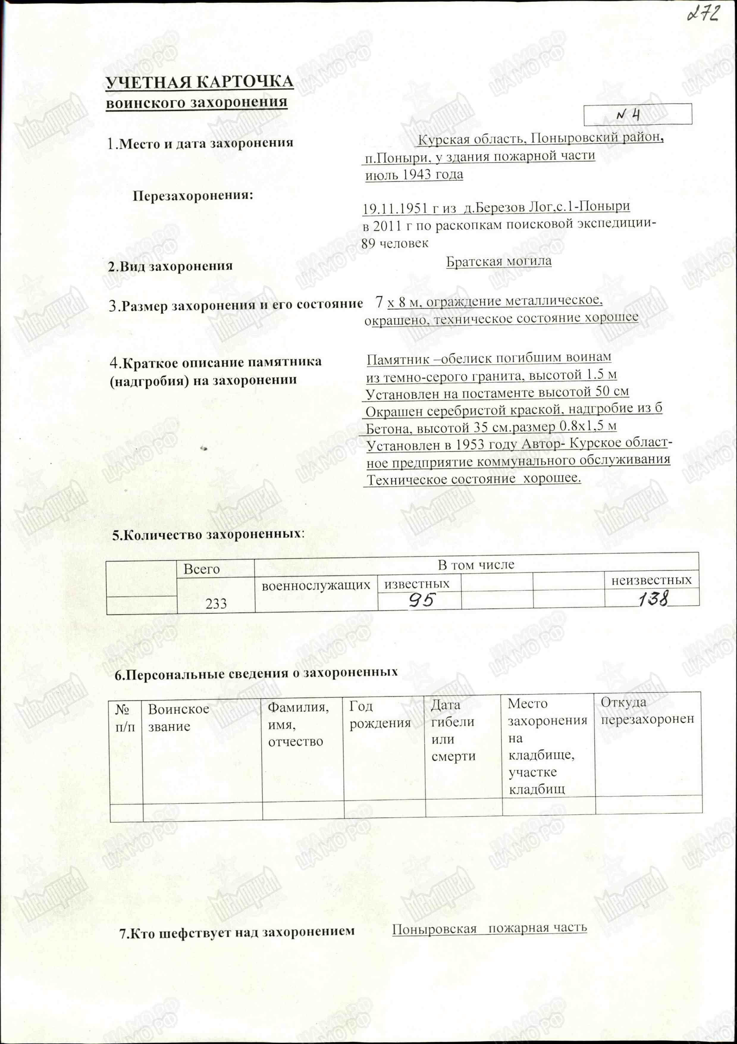 | Полное название | Воинское захоронение в п. Поныри у пожарной части, Поныровский район Курская область |
