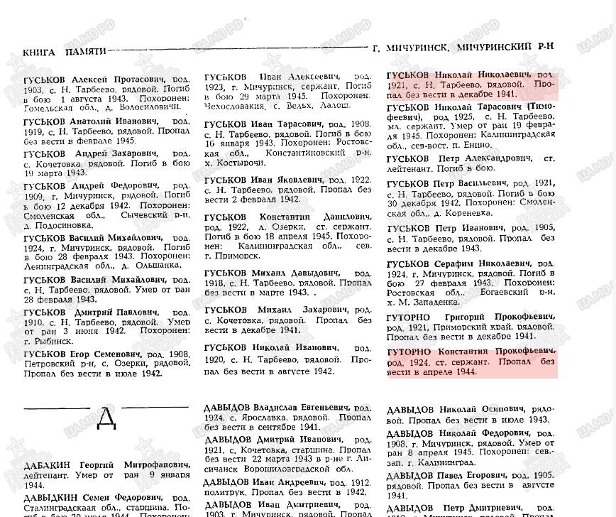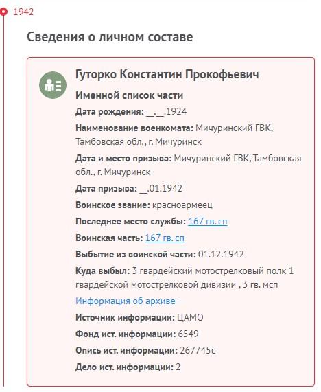 | Призван РВК | Мичуринский ГВК, Тамбовская обл., 30.01.1942 |