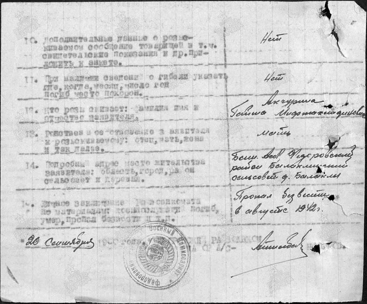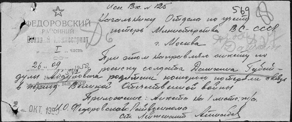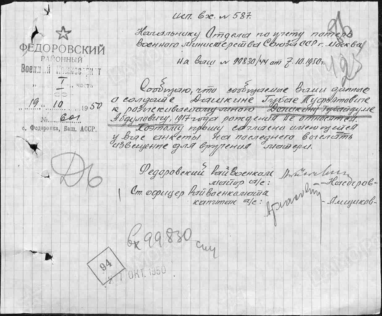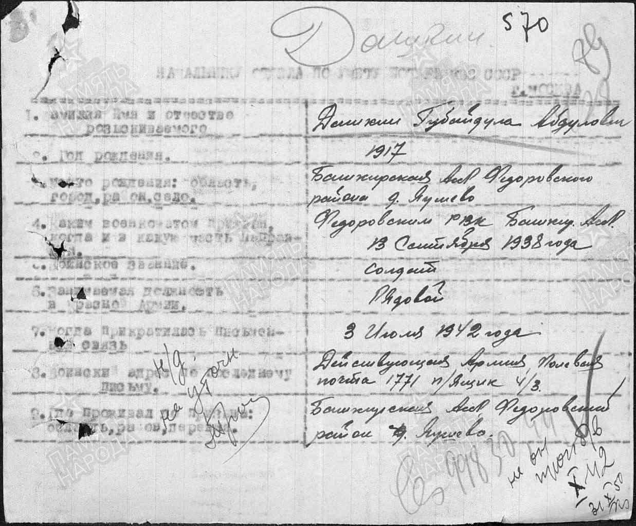 | Призван РВК | Федоровский РВК, Башкирская АССР, 13.09.1938 |