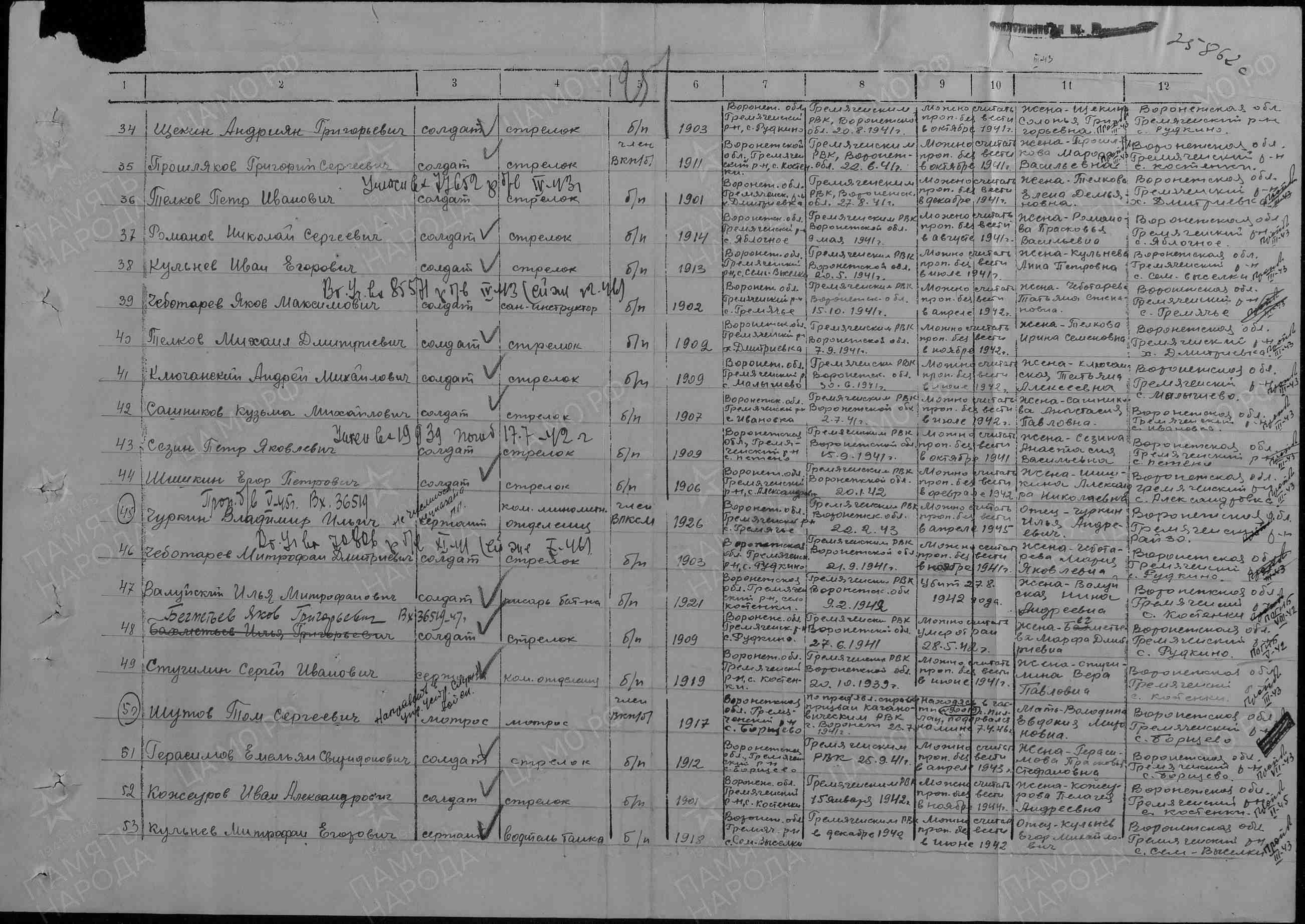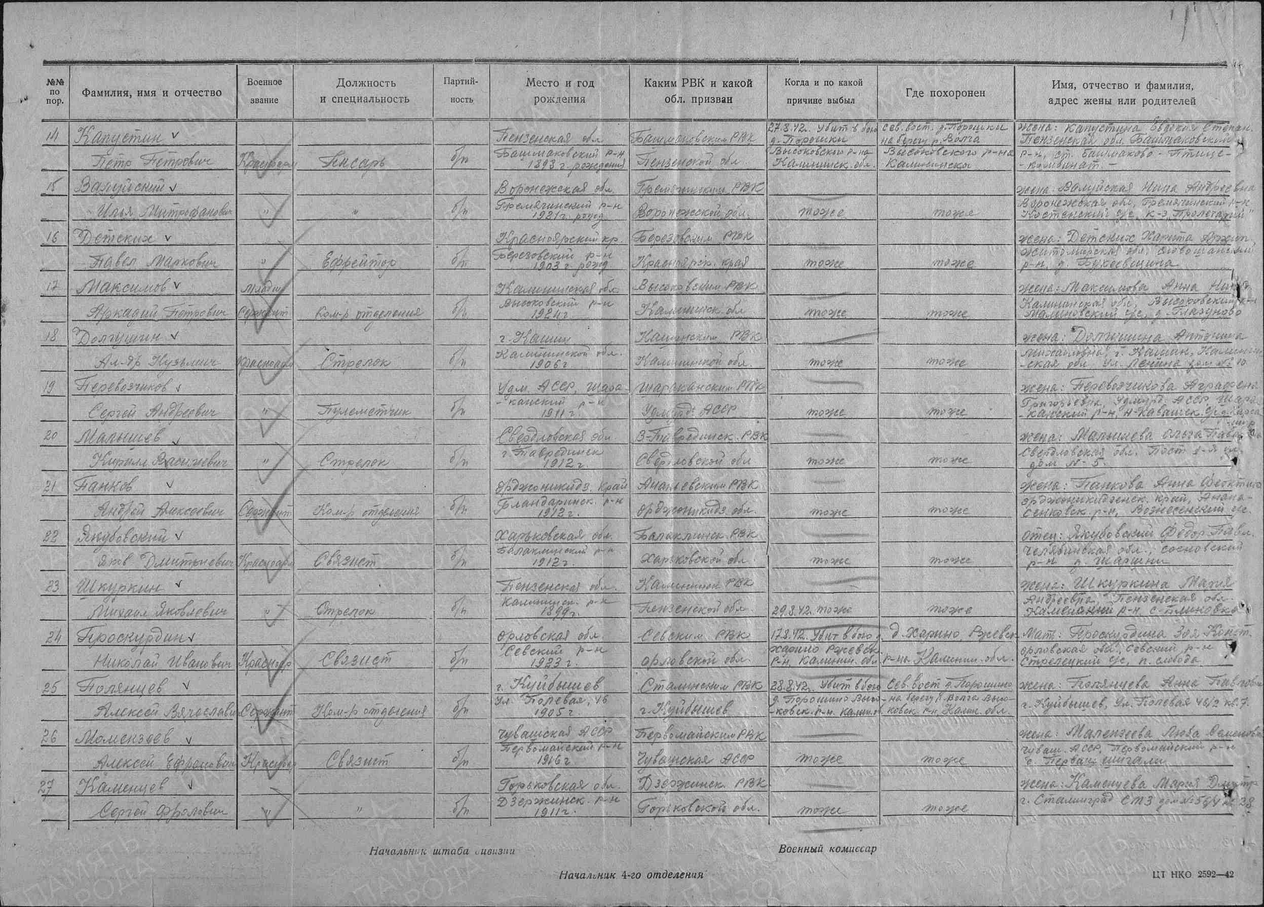 | Призван РВК | Гремяченский РВК, Воронежская обл., 09.02.1942 |