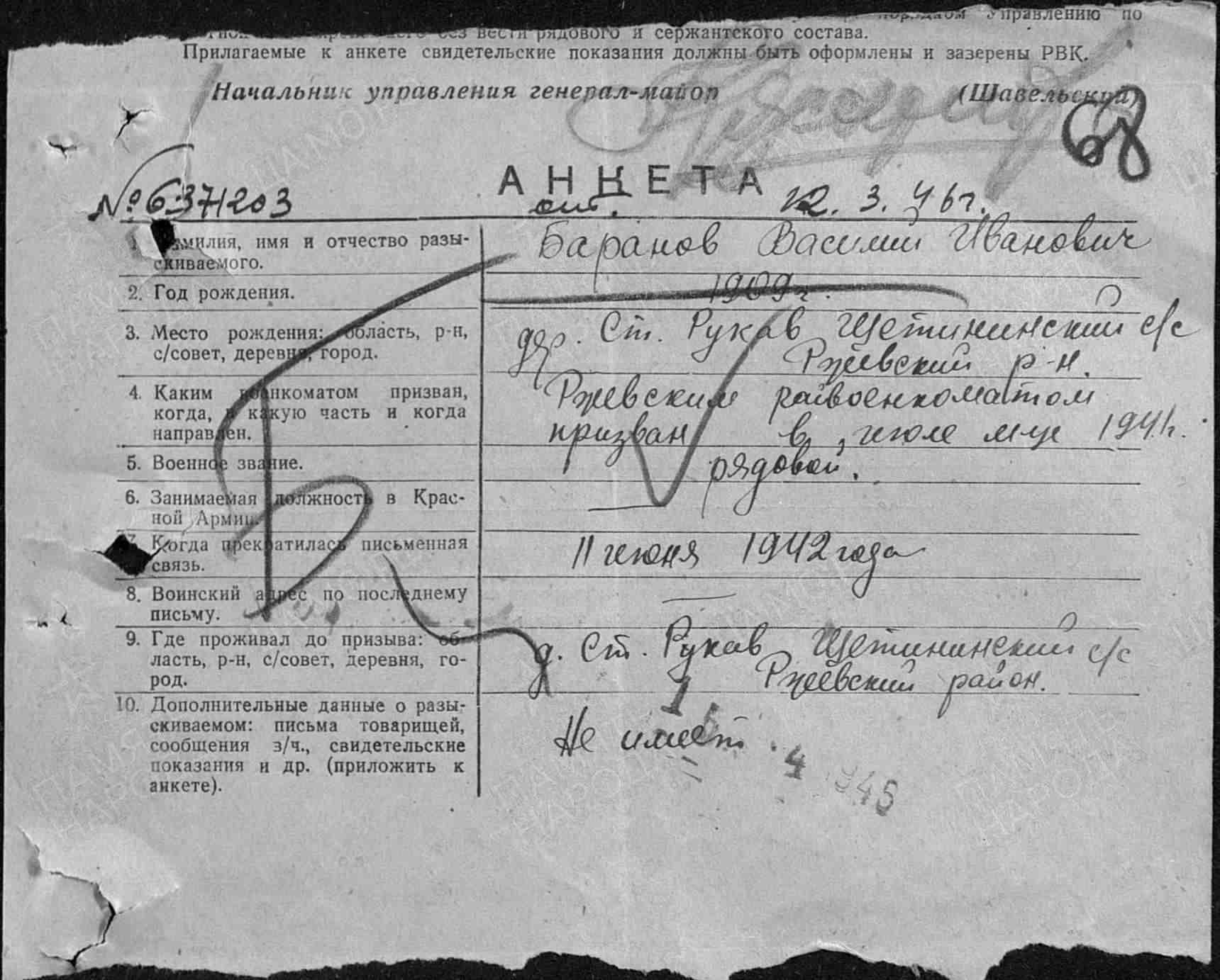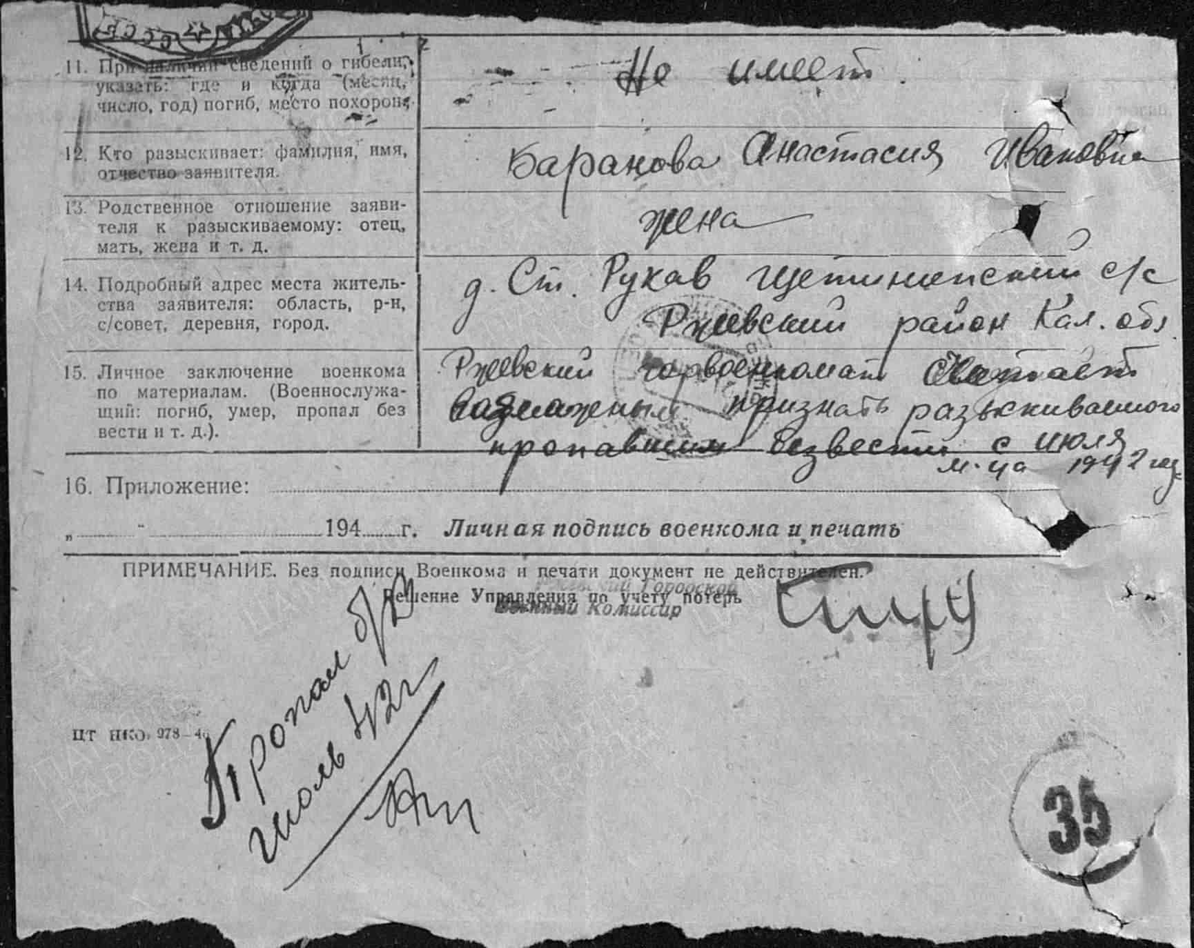 | Призван РВК | Ржевский РВК, Калининская обл. |