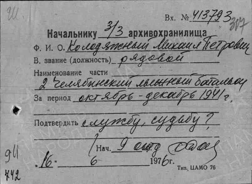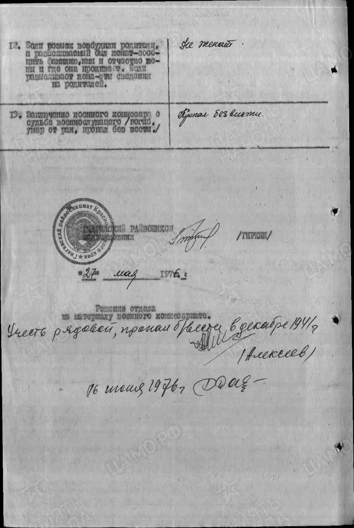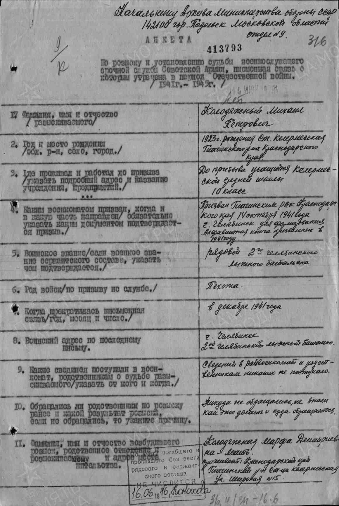 | Призван РВК | Гиагинский РВК, Краснодарский край, 14.10.1941 |
