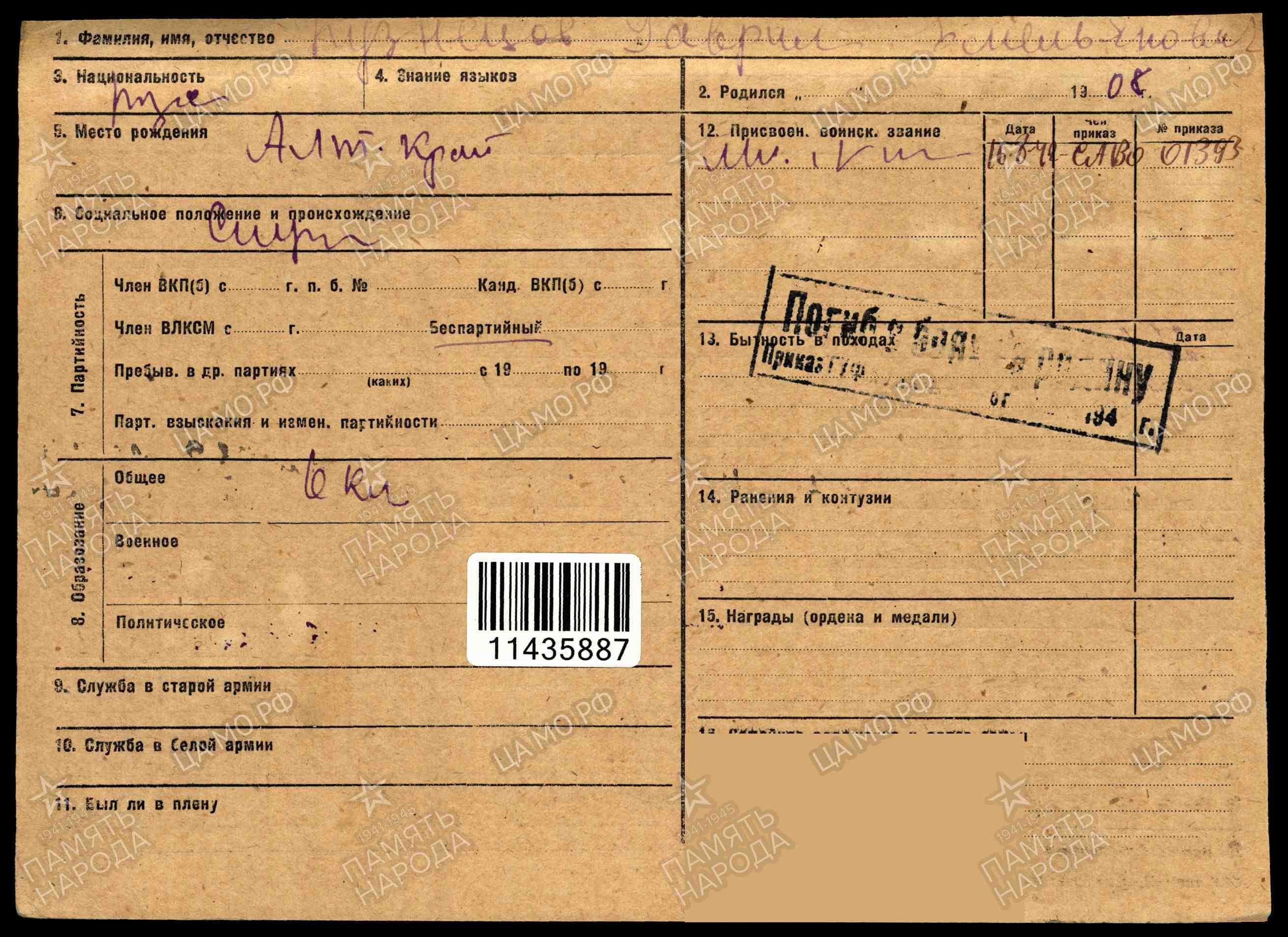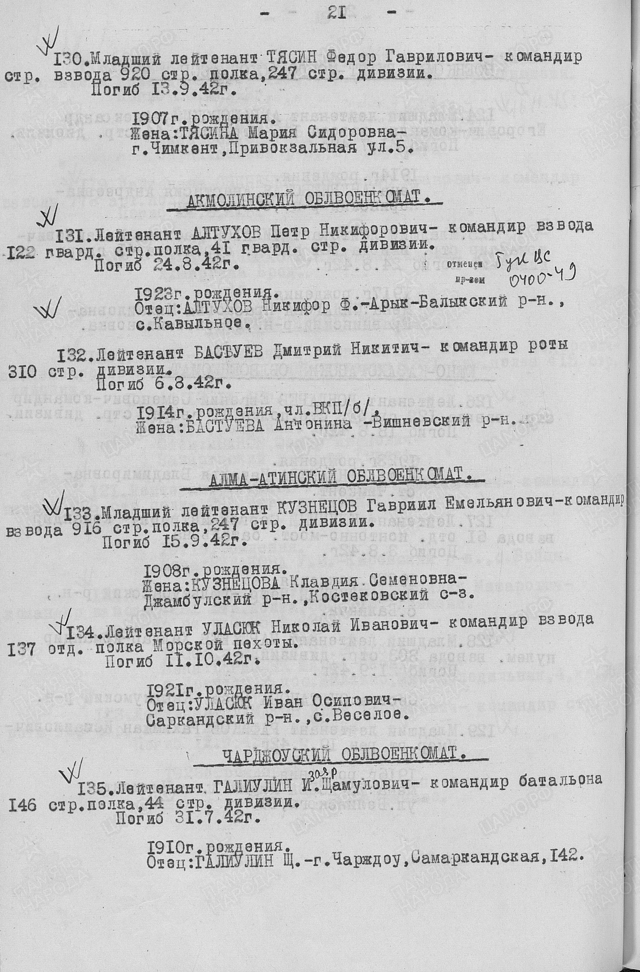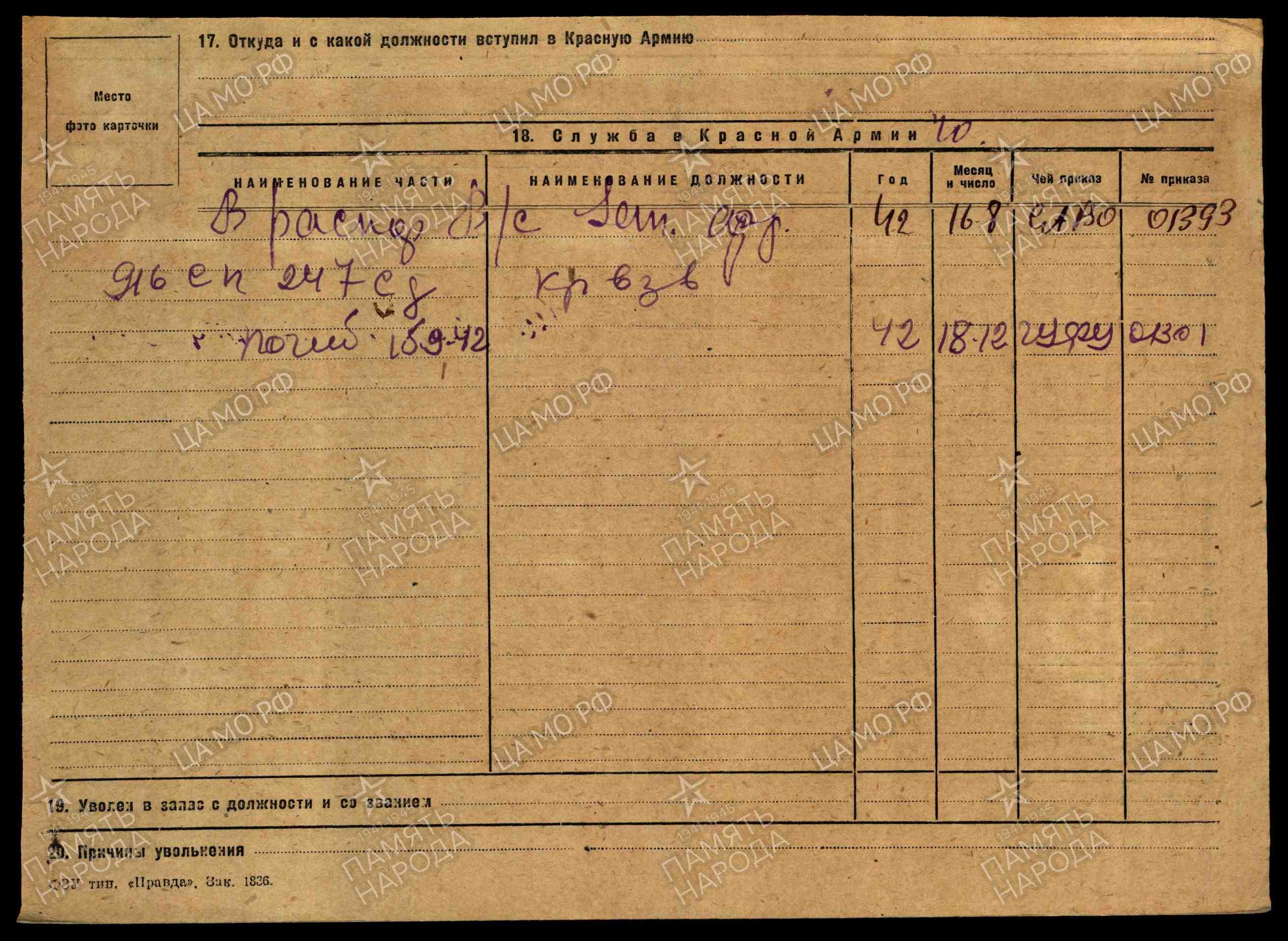 | Призван РВК | Алма-Атинский РВК, Казахская ССР, 1940г. |