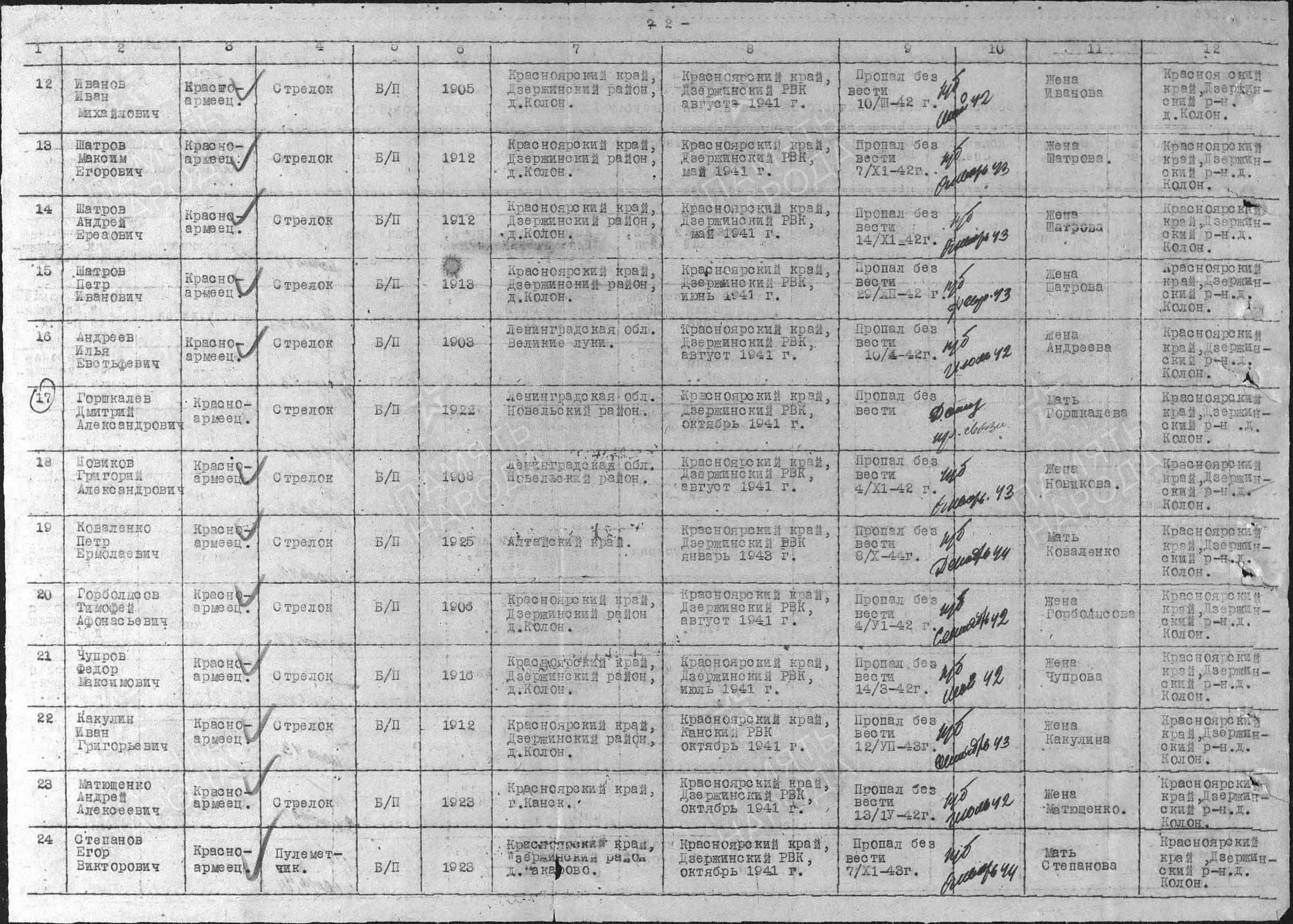 | Призван РВК | 07.1941 Дзержинский РВК, Красноярский край |