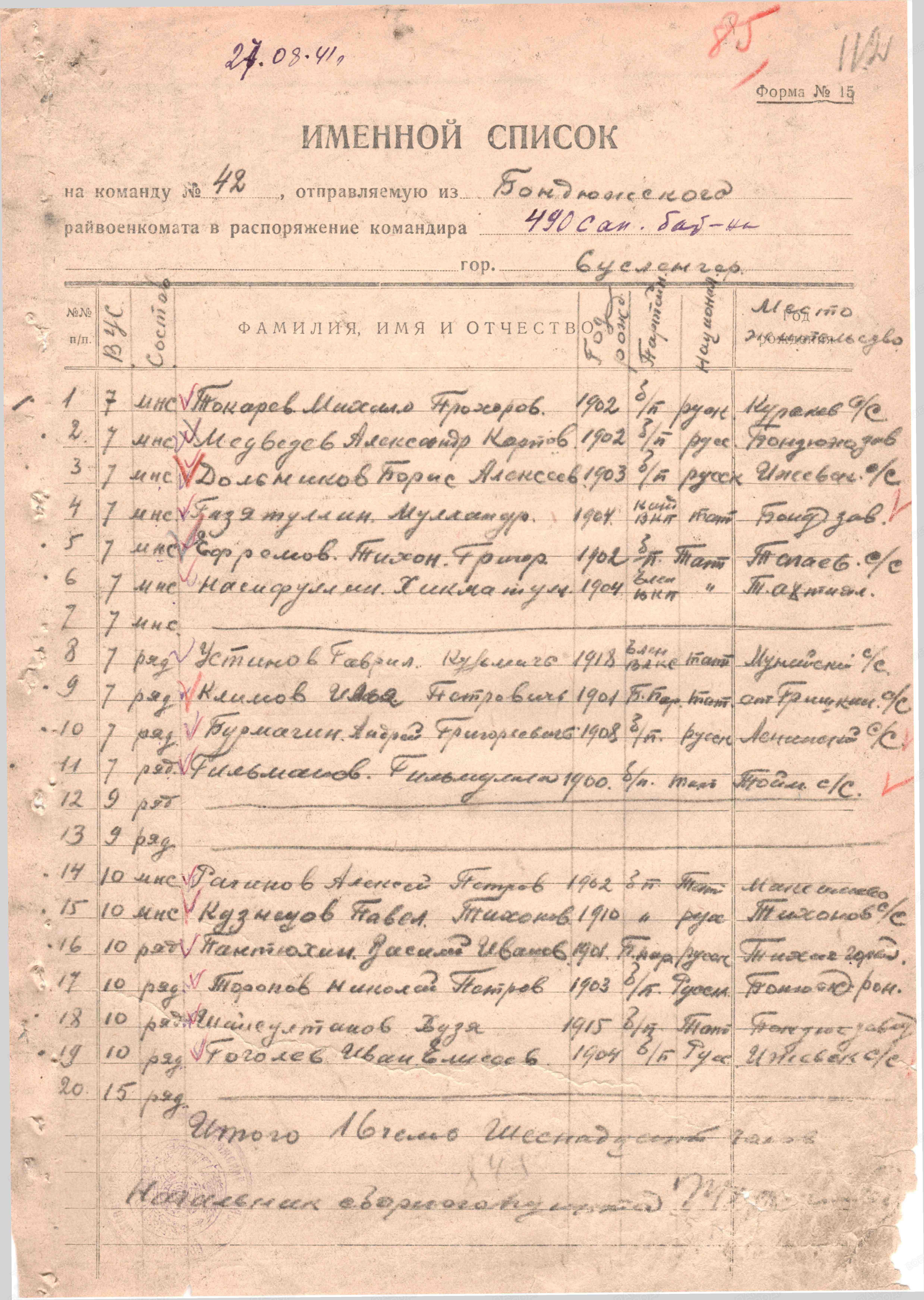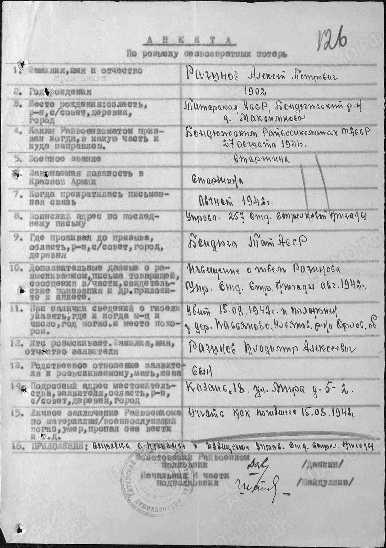 | Призван РВК | Бондюжский РВК, Татарская АССР, 27.08.1941 |