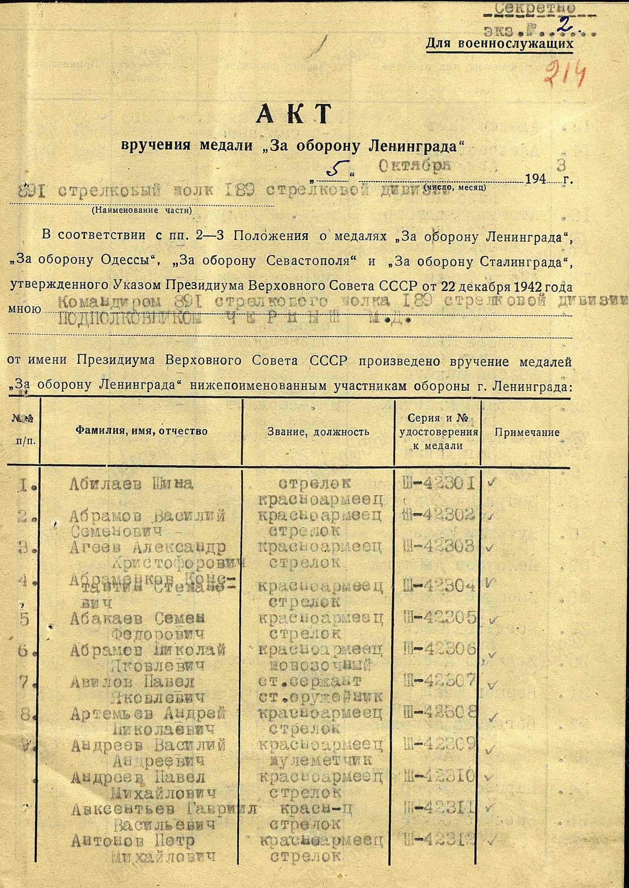 | Призван РВК | Ленинский РВК г.Ленинграда, 17.05.1942г. |