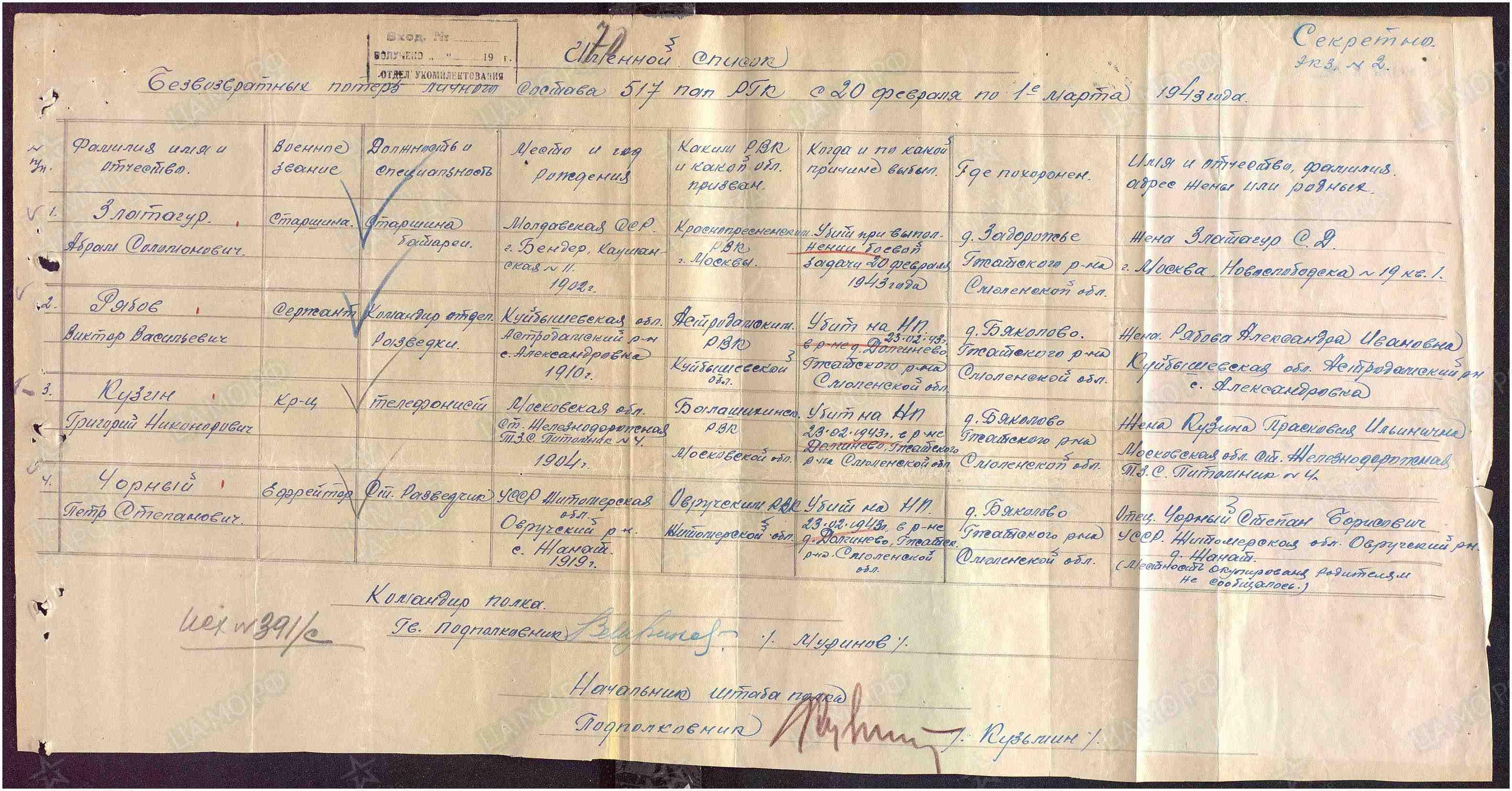 | Дата выбытия | 23.02.1943 |