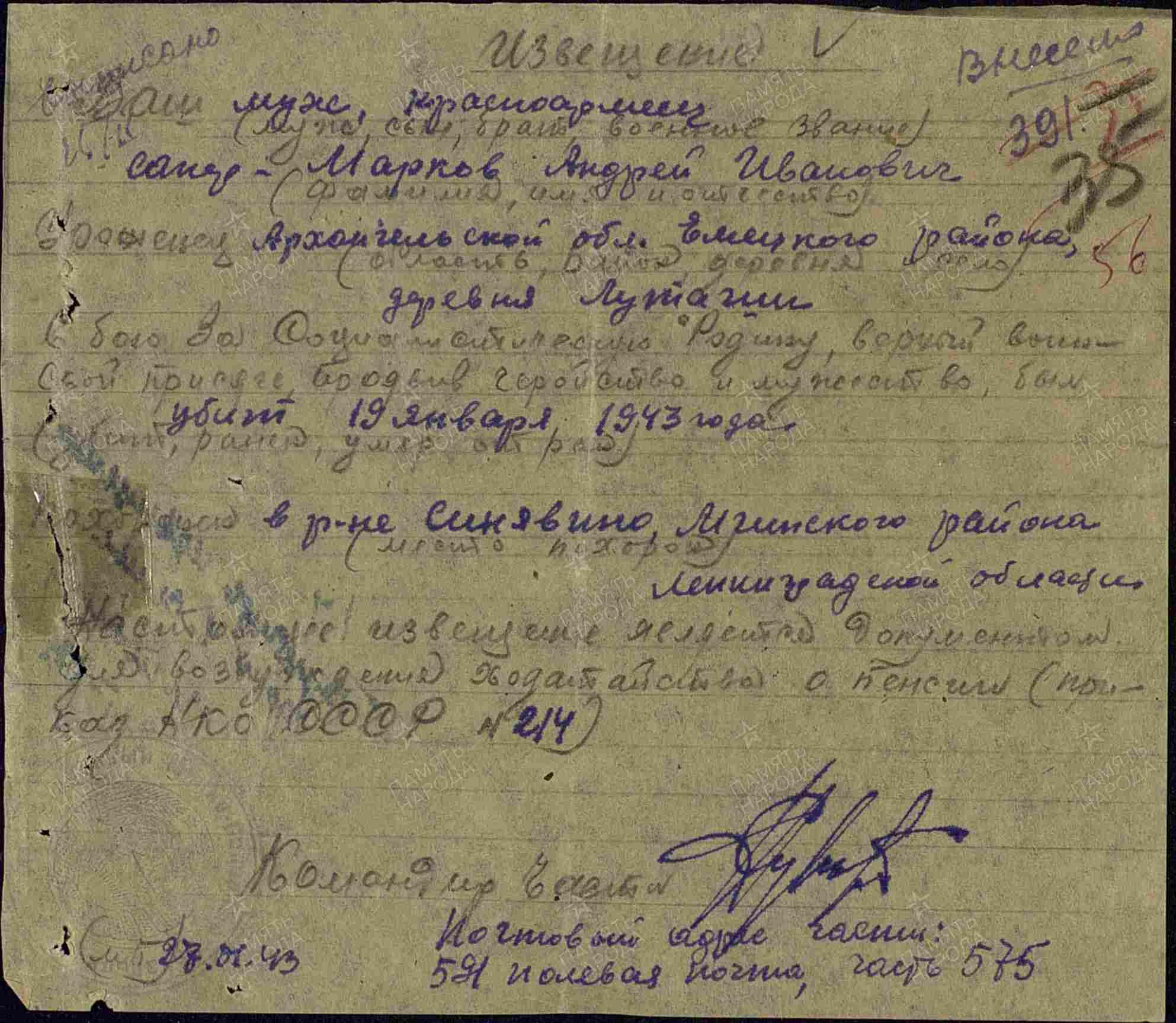 | Дата выбытия | 19.01.1943 |