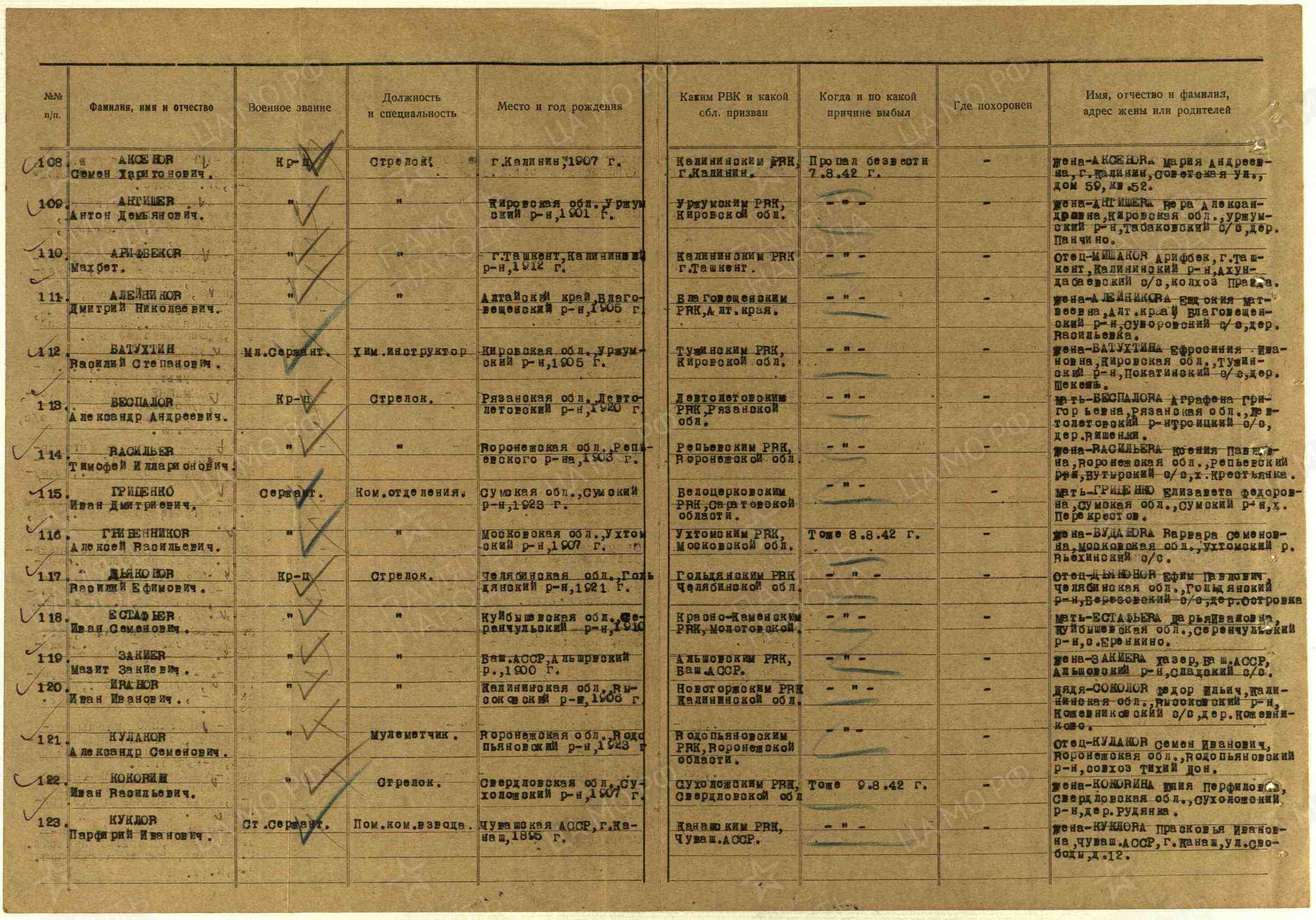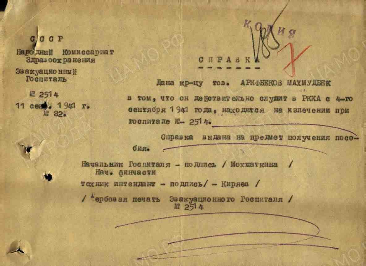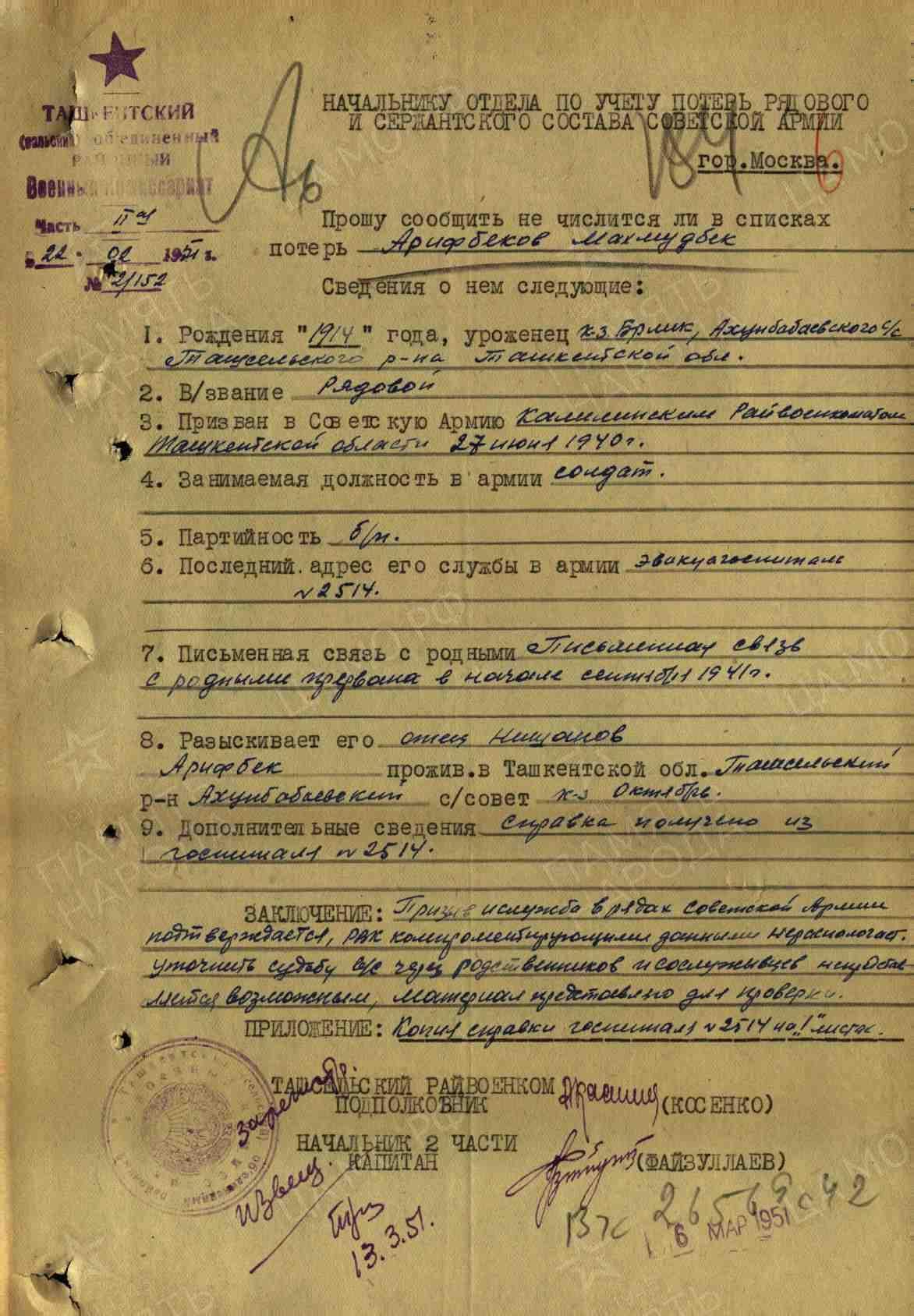 | Призван РВК | Калининский РВК, Узбекская ССР, 27.06.1940 |