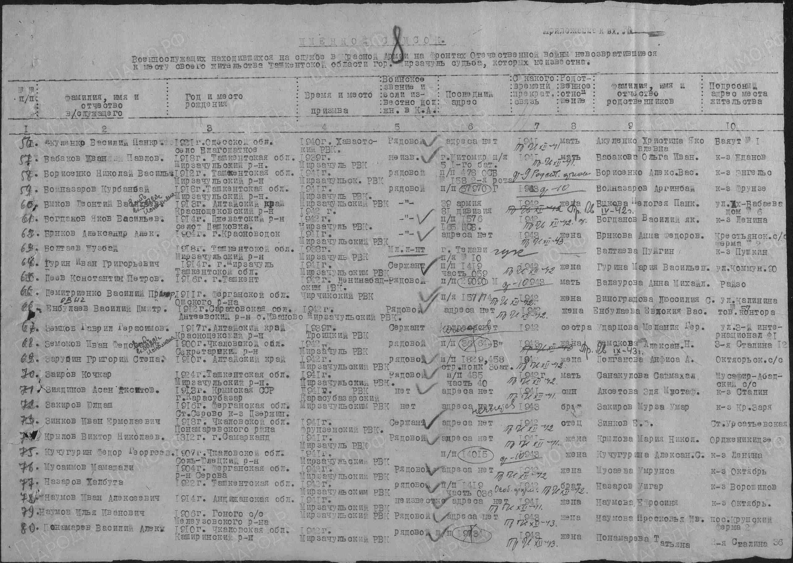 | Призван РВК | Мирзачульский РВК, Узбекская ССР, 1942 |