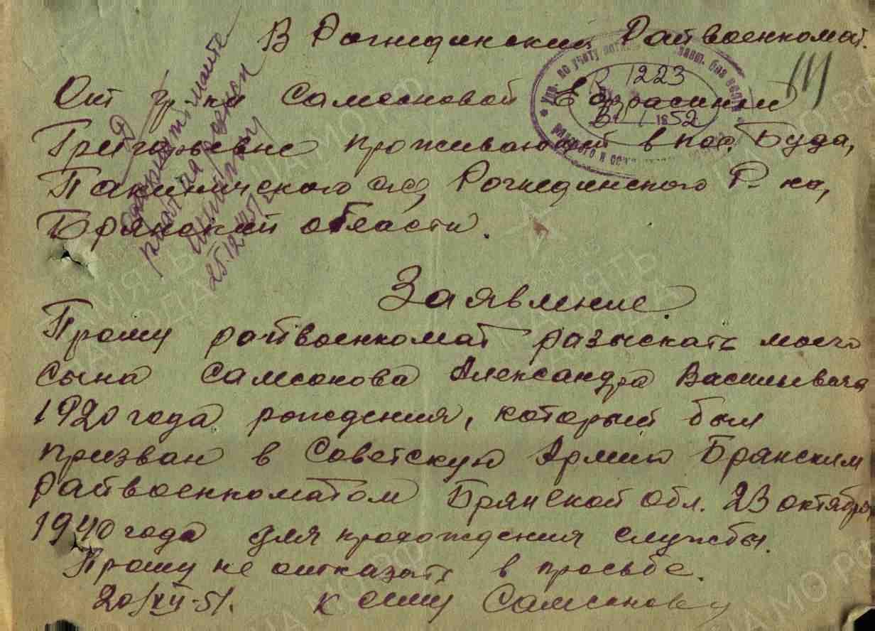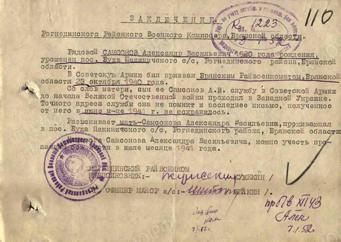 | Призван РВК | Брянский РВК, Брянская обл., 23.10.1940 |